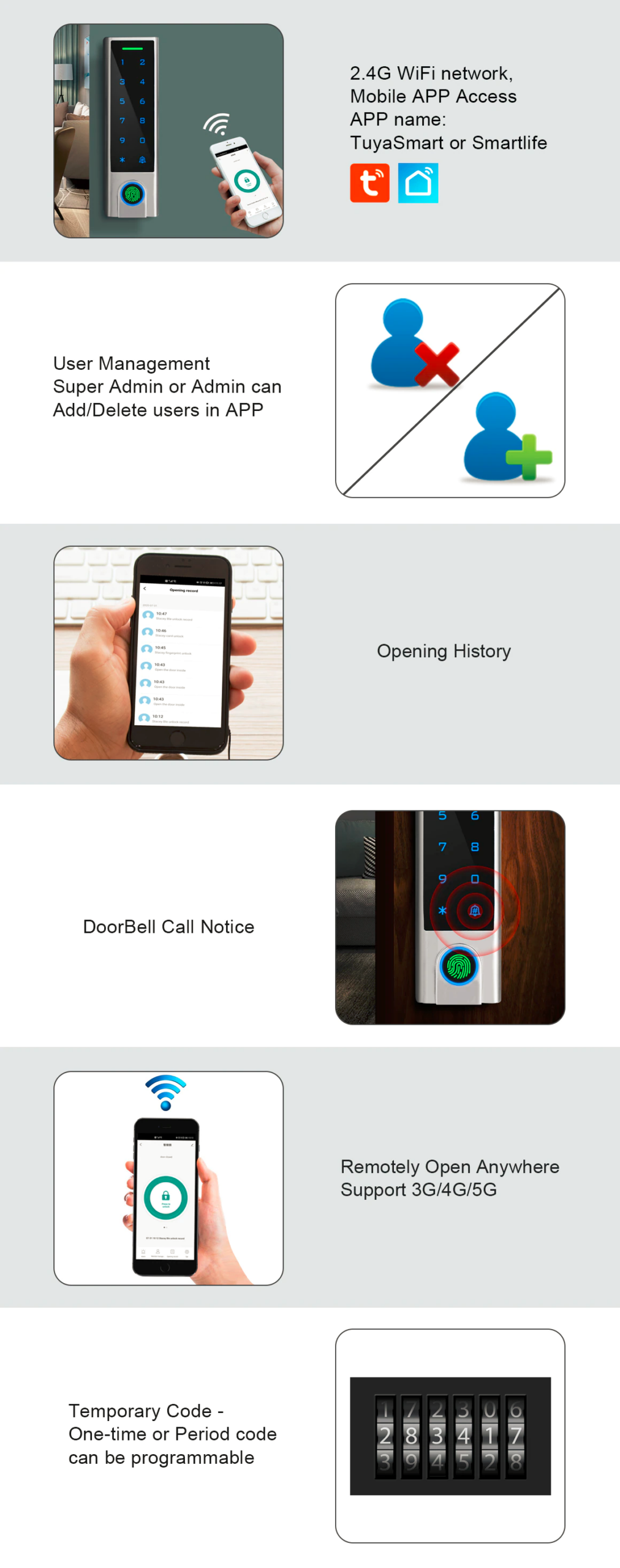 withTuya which supports 100 users (including 255 fingerprint / card/ PIN users). It’s available for both iOS and Anddroid.